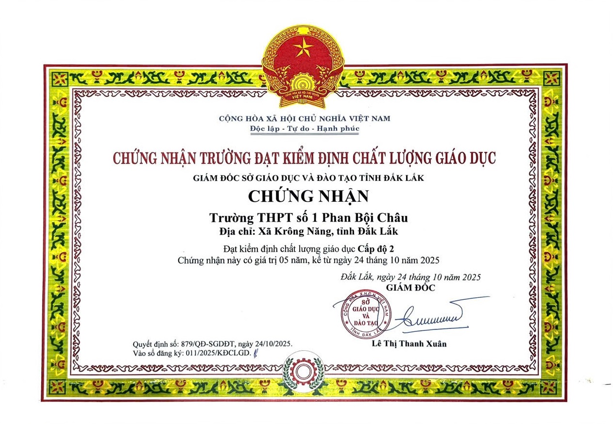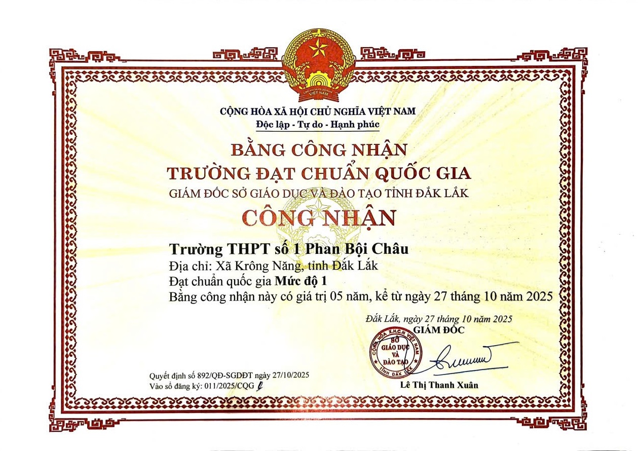 Ngày 19/11/2025, Trường THPT số 1 Phan Bội Châu tổ chức Lễ đón nhận bằng công nhận trường chuẩn quốc gia mức độ I (Lần 2) và kỷ niệm 43 năm ngày nhà giáo Việt Nam (20/11/1982 – 20/11/2025)