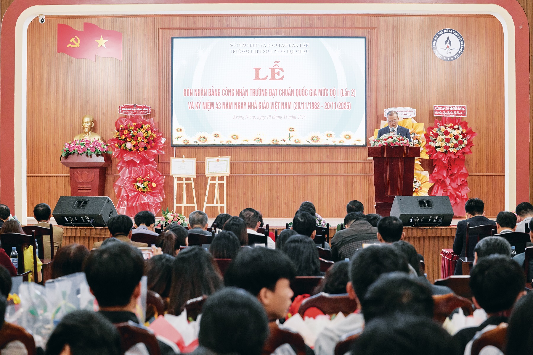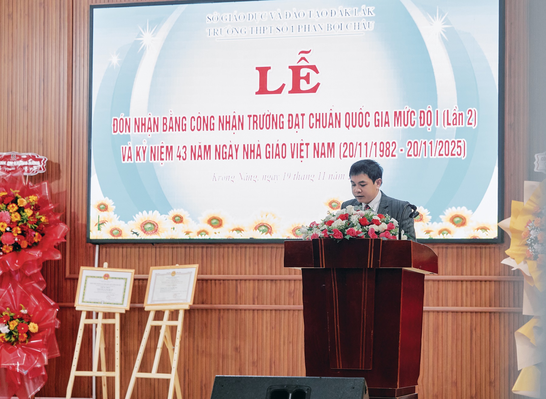 Tại buổi lễ, thầy Mai Công Thành – Đảng ủy viên, Phó hiệu trưởng nhà trường thừa ủy quyền Giám đốc Sở Giáo dục và Đào tạo công bố Quyết định về việc Công nhận trường THPT số 1 Phan Bội Châu đạt chuẩn kiểm định chất lượng mức độ 2 và Quyết định về việc công nhận trường đạt chuẩn quốc gia mức độ 1.