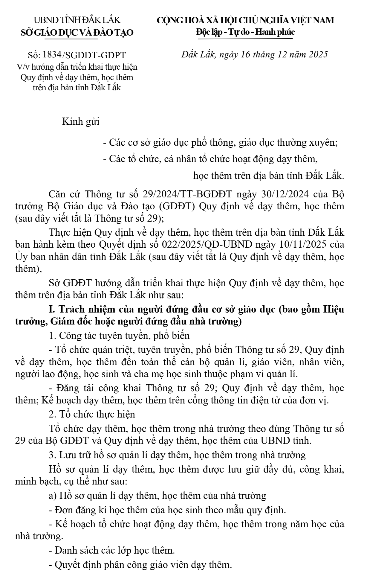 Văn bản hướng dẫn về việc triển khai thực hiện quy định dạy thêm, học thêm trên địa bàn tỉnh Đắk Lắk